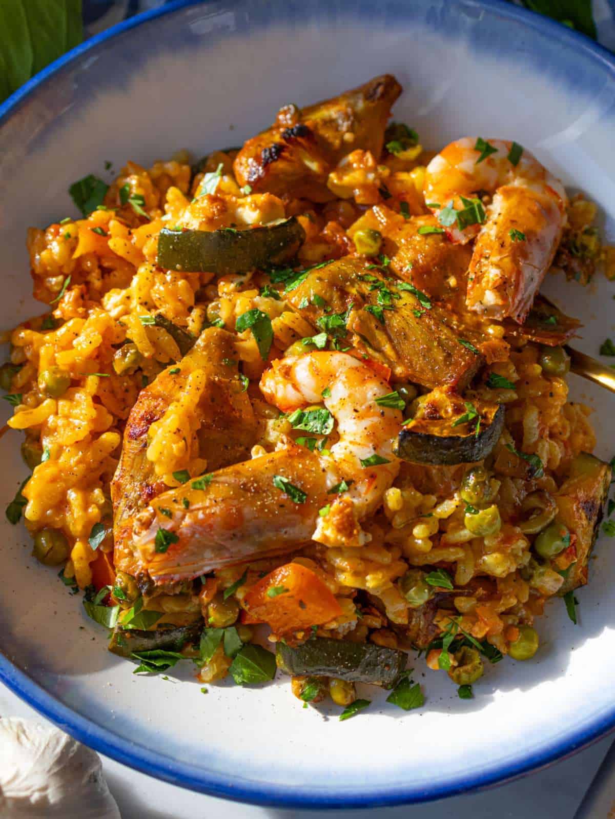 - Risotto rice: Arborio or carnaroli give that classic paella-style texture and work perfectly in the oven. Traditional paella uses bomba rice, but we recommend sticking with risotto rice for this version because it's similar, easy to find, and cooks reliably in this one pan method. We don’t recommend swapping rice, since each type needs a different amount of broth and can change the final texture.